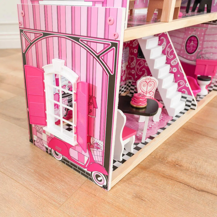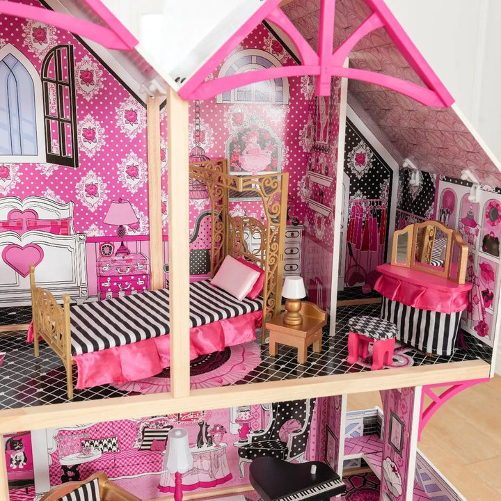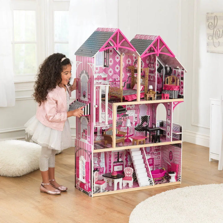 - تصميم أنيق : تصميم السقف الرائع والأثاث المفصل والميزات المتميزة تجعل بيت الدمية هذا جميلاً وعمليًا.