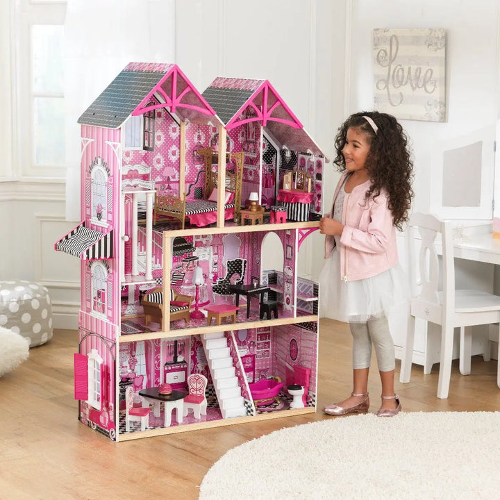 يوفر بيت الدمى بيلا من كيد كرافت مساحة لعب واسعة لدمى طفلك التي يبلغ طولها 12 بوصة، ويبلغ ارتفاعها أربعة أقدام. مع ثلاثة مستويات وخمس غرف وشرفة ساحرة في الطابق الثاني، يدعو بيت الدمى هذا الأطفال لاستكشاف وإنشاء قصص خيالية. يربط المصعد المنزلق الطابقين الثاني والثالث، بينما توفر النوافذ المتميزة ذات المصاريع العاملة إطلالة على التصميم الداخلي المفصل بشكل جميل. تتميز مجموعة الملحقات المكونة من 16 قطعة ببيانو يعزف الموسيقى، وطاولة زينة بمرآة حقيقية، وسرير مصمم بشكل معقد، وأكثر من ذلك بكثير، مما يجعل بيت الدمى هذا تحفة فنية حقيقية للعب الإبداعي.