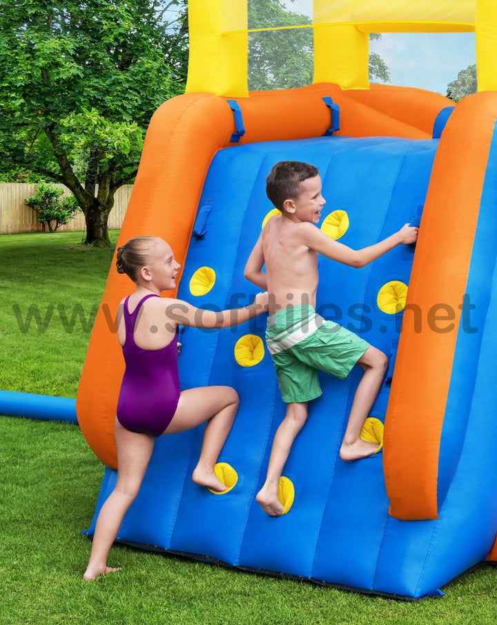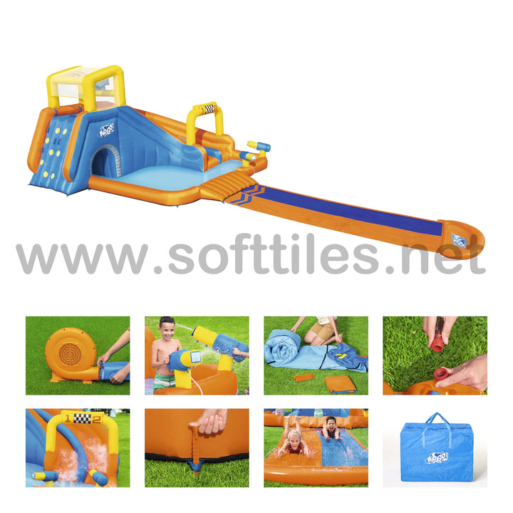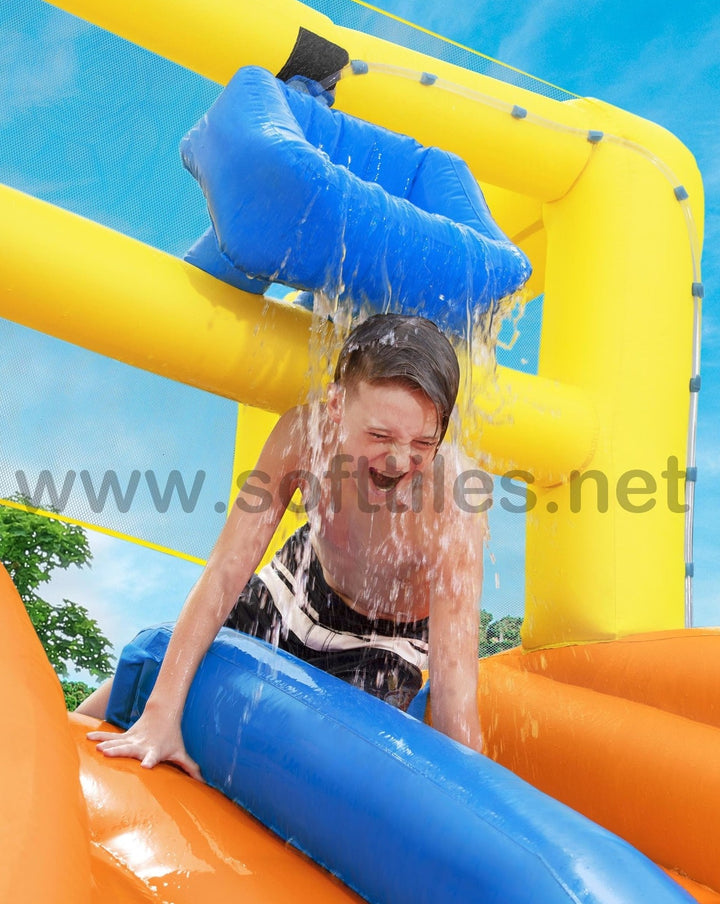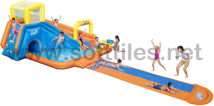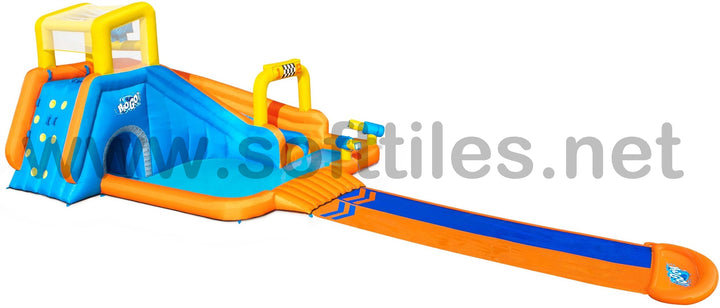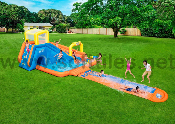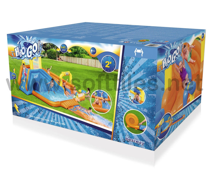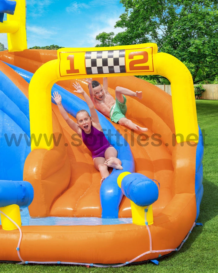 جاهز، استعد، دفقة! تسابق طوال اليوم مع حديقة H2OGO!® Splashtona Raceway Mega المائية. من البداية إلى النهاية، تجلب هذه الحديقة العملاقة القابلة للنفخ مضمار السباق إلى الفناء الخلفي الخاص بك مع ميزات مزدوجة بحيث يمكن لطفلين الذهاب إليه في وقت واحد. تؤدي جدران التسلق المزدوجة إلى شريحتين، تحتويان على دلو تفريغ تلقائي في الأعلى سينقع الأطفال بشكل عشوائي أثناء السباق. يوجد في الجزء السفلي من الشريحة قاذفان للمياه يعملان بنظام النقاط والرش. اربح المنافسة من خلال الانزلاق إلى أسفل الشريحة ذات المسارين التي يبلغ ارتفاعها 4.88 م (16 قدمًا) حتى نهاية حوض السباحة المنقوع! يتم ربط الشريحة بمنحدر هوائي للحصول على متعة السباق فائقة السرعة. بالنسبة للأطفال الذين لا يتسابقون، هناك حوض سباحة كبير جدًا مع نفق للعب فيه. سيتسابق الأطفال في وقت قصير جدًا، لأن المنفاخ المتضمن ينفخ هذه الحديقة المائية العملاقة بأكملها في دقيقتين فقط!