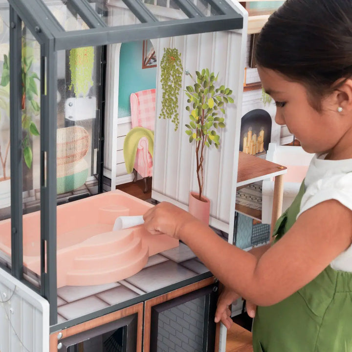 - بيت زجاجي مع سبا : ملاذ للاسترخاء مزود بسبا مدمج للدمى للاسترخاء.