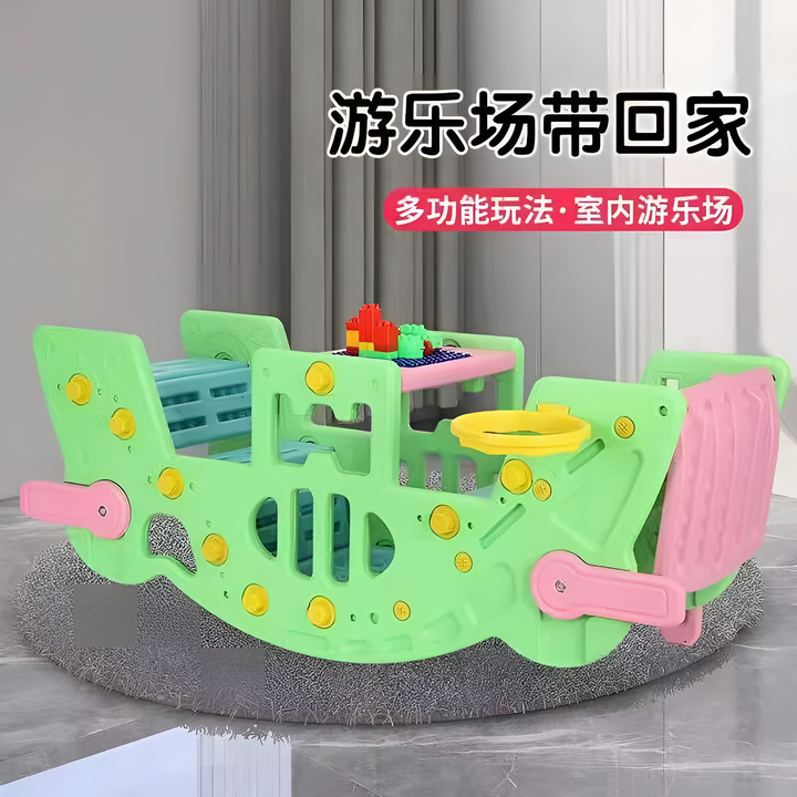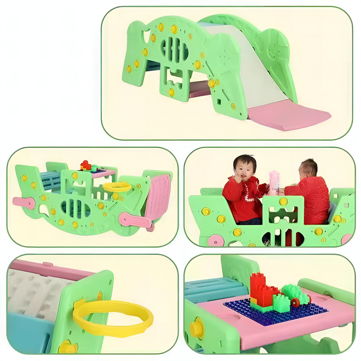 تصميم 5 في 1: تعمل كزحليقة، مرجيحة (سي سو)، طاولة ألغاز، حلقة تسديد ومرمى، بالإضافة إلى طاولة للطعام أو الأنشطة اليدوية. منتج واحد يوفر أنشطة متعددة.
