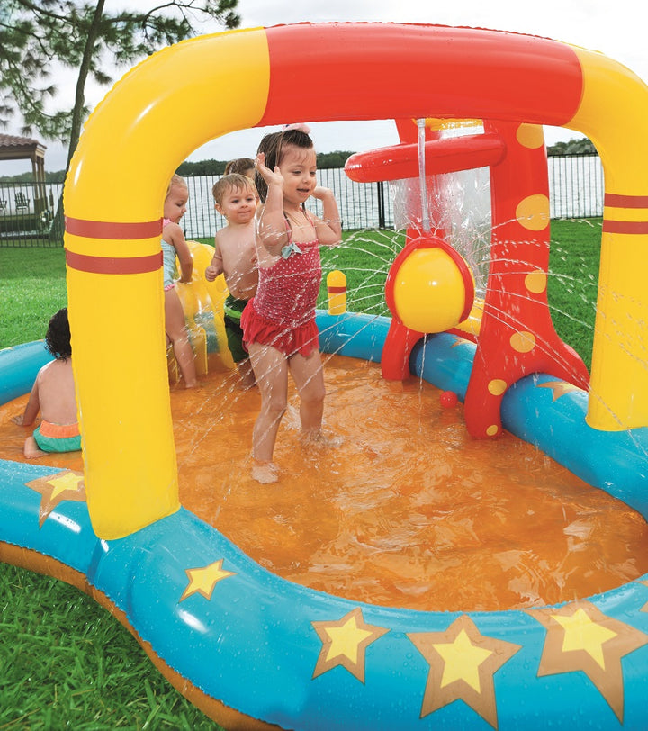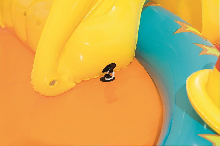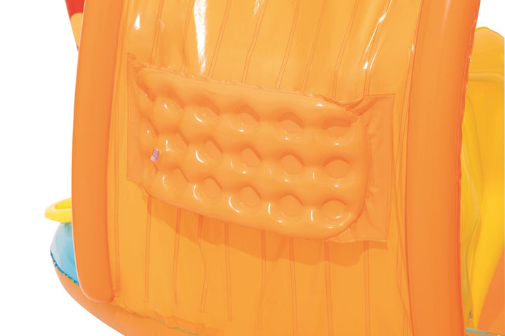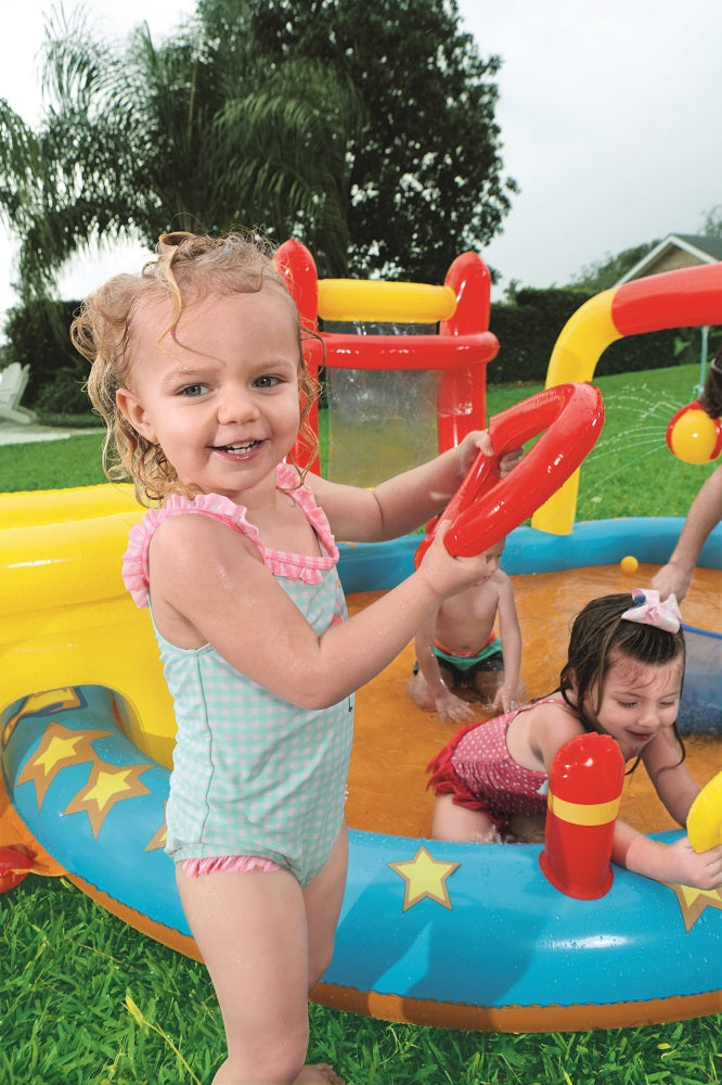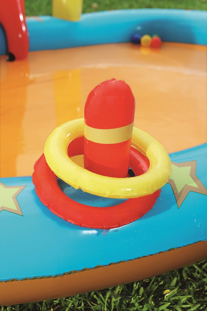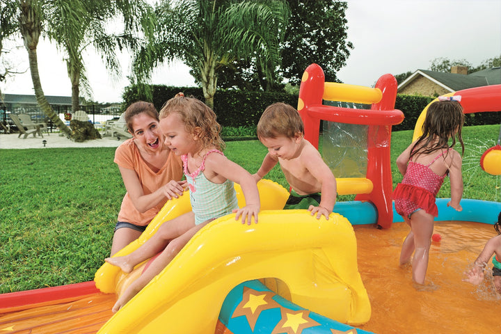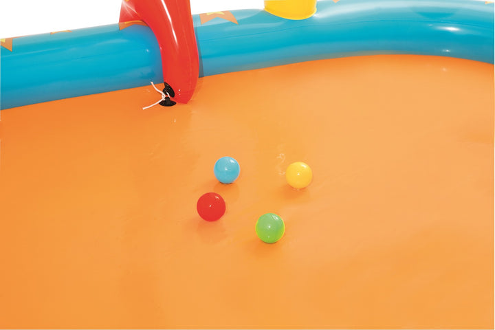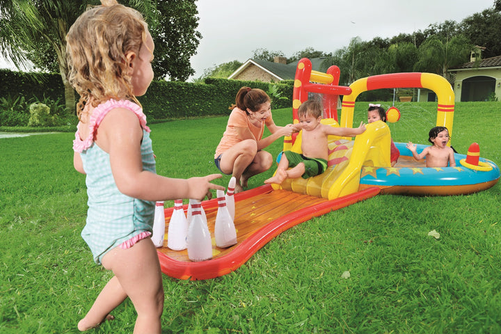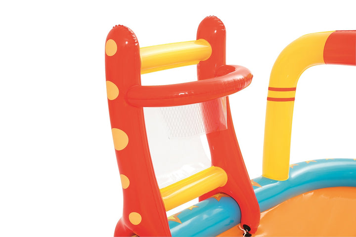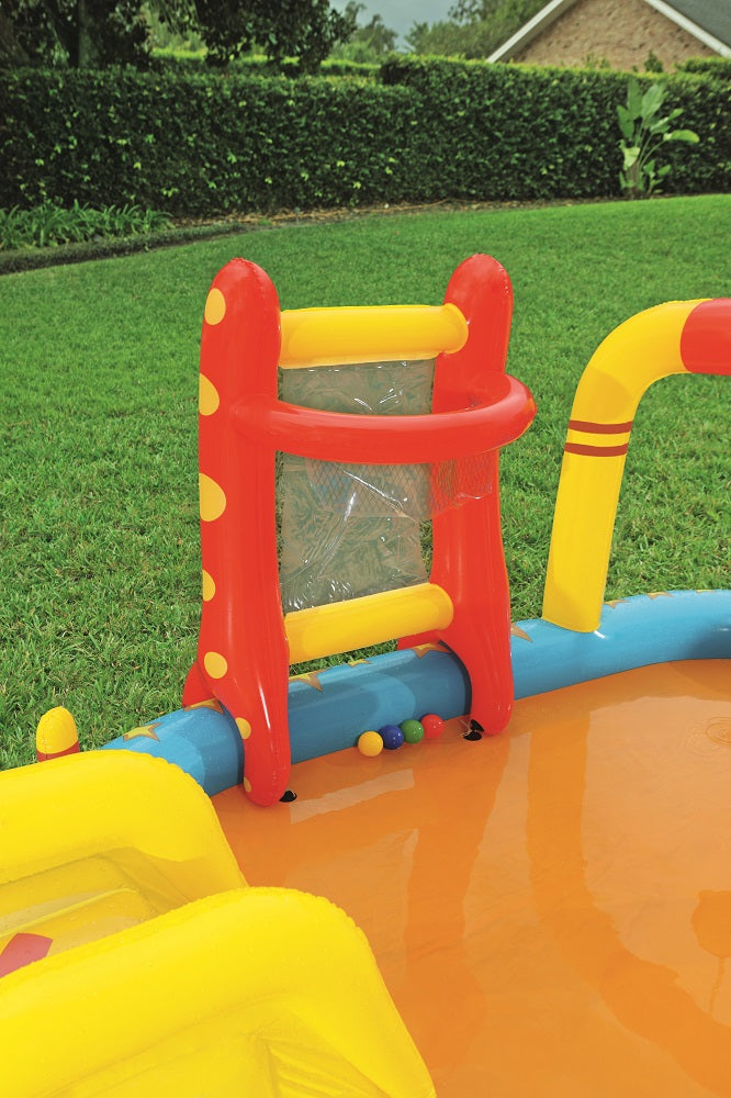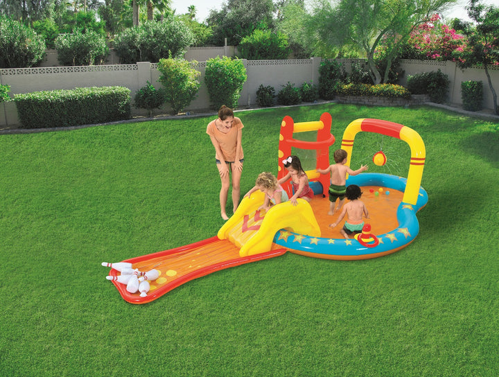 يتميز مركز اللعب Bestway Lil' Champ بزلاقة ممتعة وستة دبابيس بولينج وحامل كرة سلة واحد وأربع كرات لعب وحلقتين قابلتين للنفخ. تم بناء المسبح من الفينيل القوي الذي تم اختباره مسبقًا ويتضمن صمامات أمان وأرضية حمام سباحة مبطنة وحبال ربط وحلقات للشريحة القابلة للإزالة.