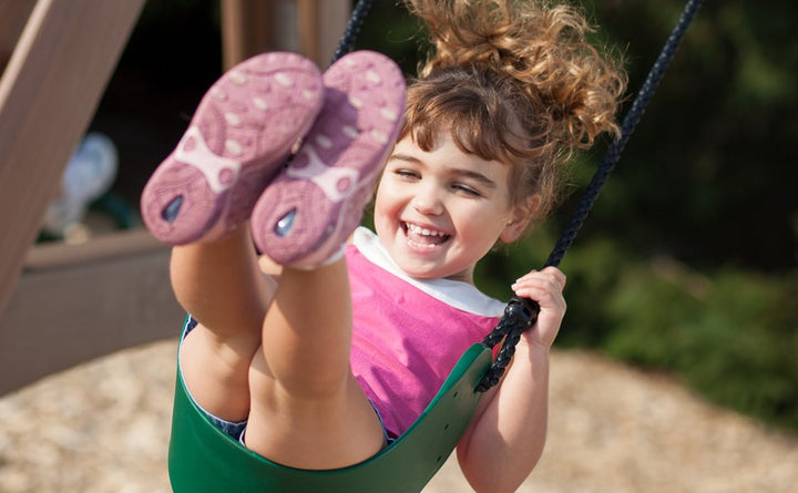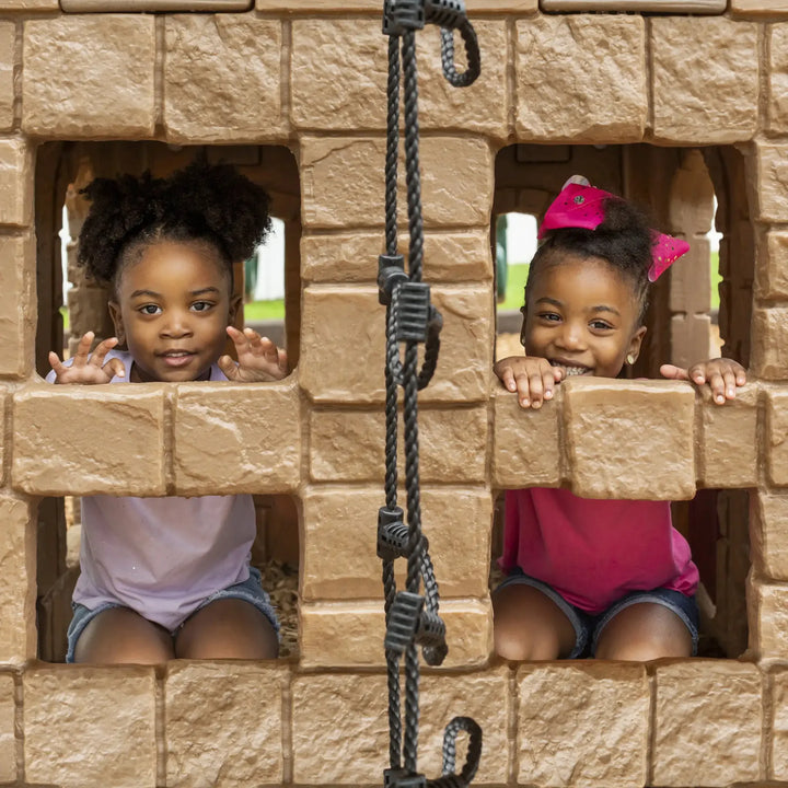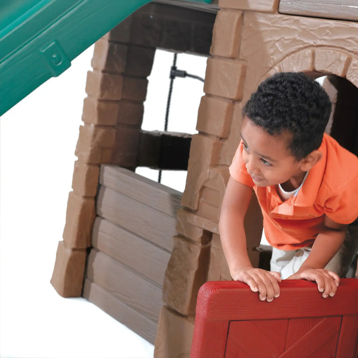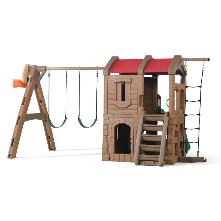 Complete with a two-story clubhouse, this kids swing set has so many cool features to keep them entertained and outside with active play for hours! The Naturally Playful Adventure Lodge Play Center is a great way to get multiple kids outside socializing and playing together, from the swings and clubhouse hiding spot with working door to the backboard hoop for a quick ball toss game (sorry, ball not included) and more! Kids will enjoy climbing the rope ladder for a birds eye view of the backyard, as well as the sturdy steps into the clubhouse to take the slide back down. Their imaginations will run wild with this backyard swing set and clubhouse for kids, where pretend play awaits. Pretend the rustic lodge clubhouse is a pirate ship and use the steering wheel to escape enemy ships; fly through the sky with a make-believe airplane; and even cruise through the desert with a dune buggy the pretend play possibilities are endless! Plus, this swing set is sturdy and durable; its made EverTough to last through the most active play for years with double-wall construction thats fade resistant, never chips or needs to be stained, and is easy to clean. Secure the ground anchors to ensure this outdoor playset stays strong and in place for kids to enjoy for years to come! Made in USA of US and imported parts.