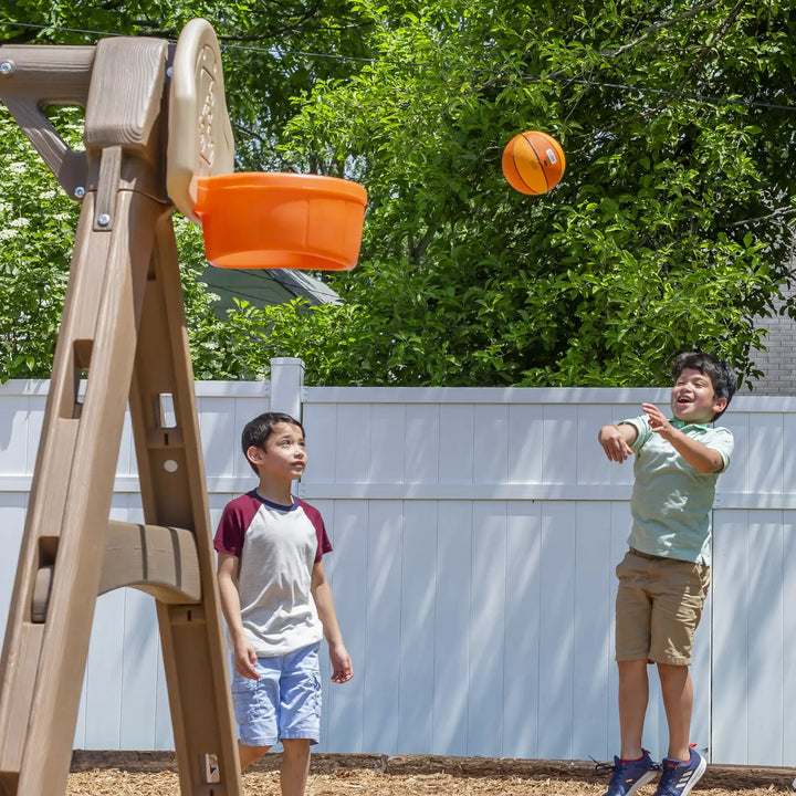 - Features multiple active play opportunities for kids, from the slide and rope ladder to ball toss backboard, swings, and playhouse to climb up into!