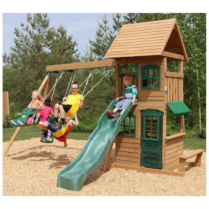 The KidKraft Windale Playset is a compact yet feature-packed swing set designed for smaller yards without compromising on fun. Measuring just 12'11"L x 10'10"W, this ingenious playset features a multi-level playscape perfect for up to nine kids. It includes a high-rail wave slide, a multi-colored rock wall leading to an upper two-story clubhouse, a working door, and a shaded café table with a bench on the lower level. Additionally, two belt swings and a premium glider provide open-air fun on the ground. Crafted from 100% premium cedar, the Windale is built to be both durable and visually appealing, proving that big ideas come in small packages.